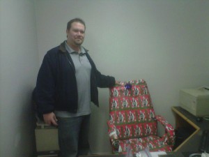 Look what I got for ChristmasBy bigmike / December 22, 2011 Here is Greg with his christmas gift, a new (not really) chair, of course wrapped in justin bieber wrapping paper!
